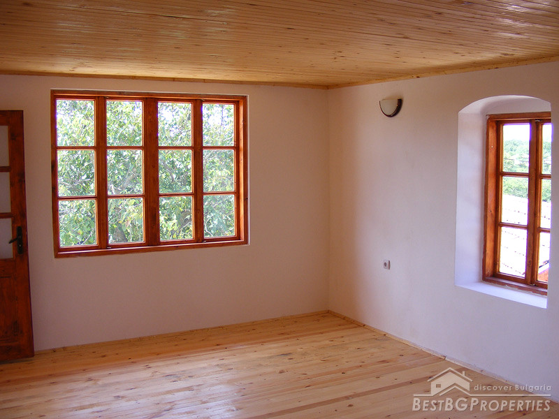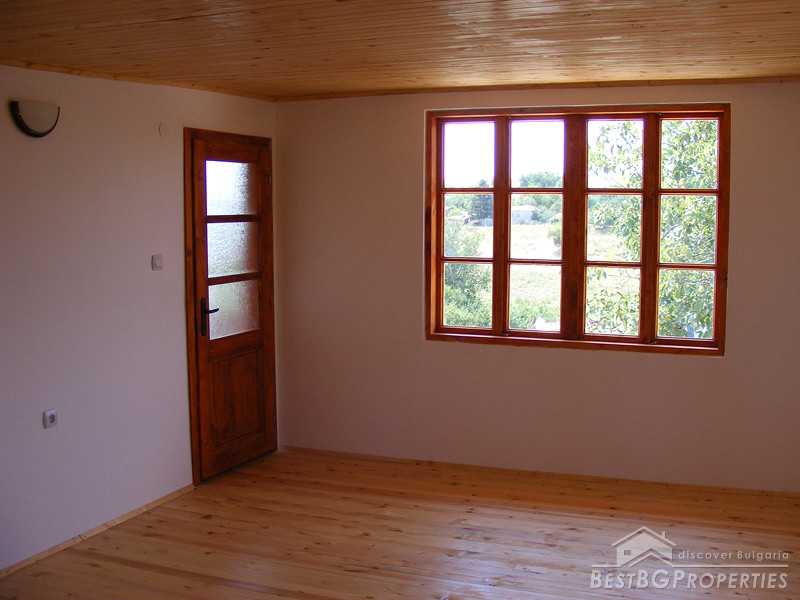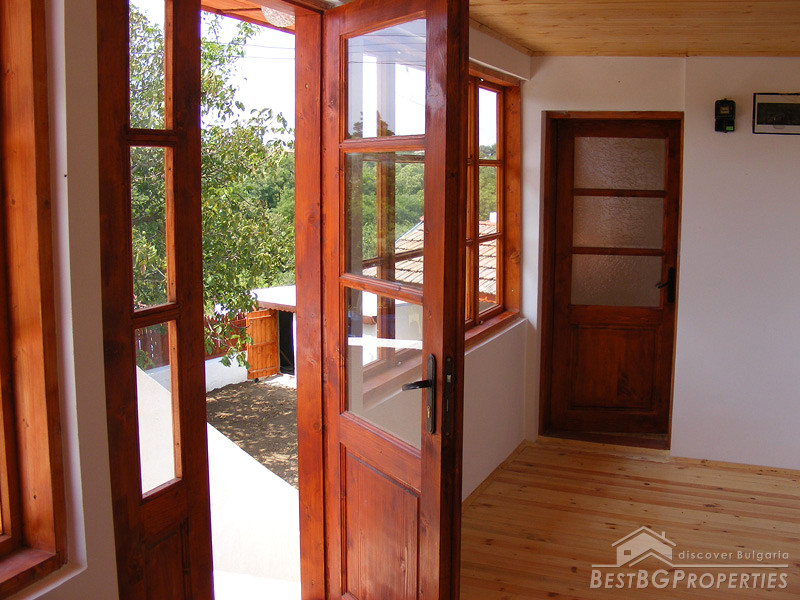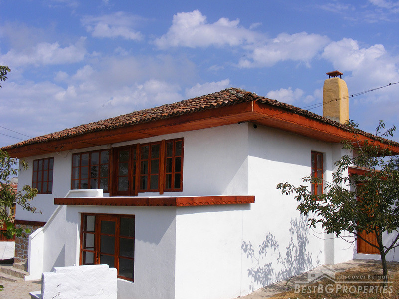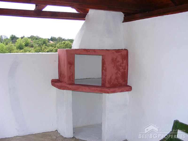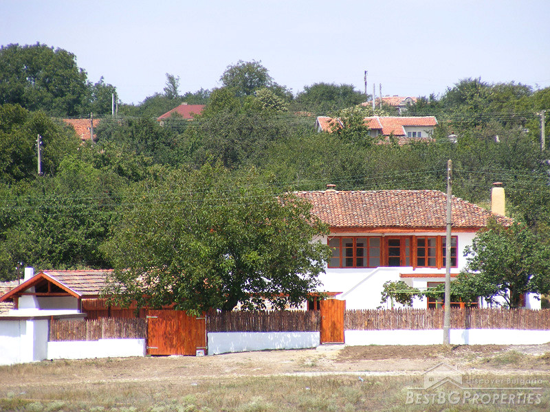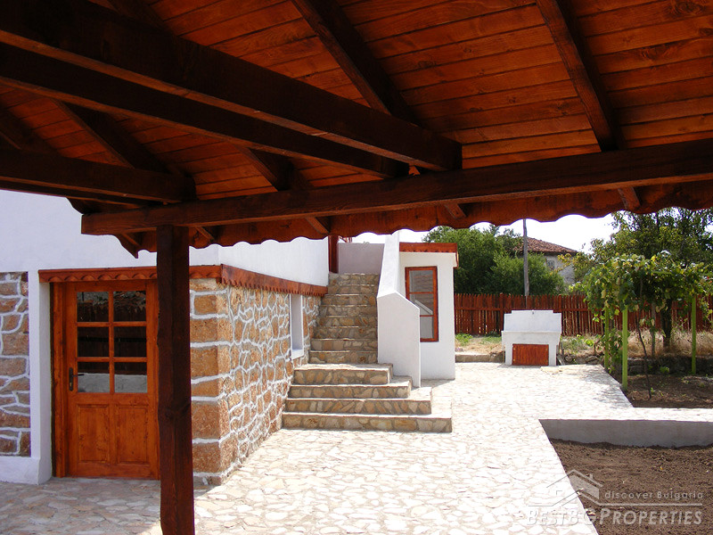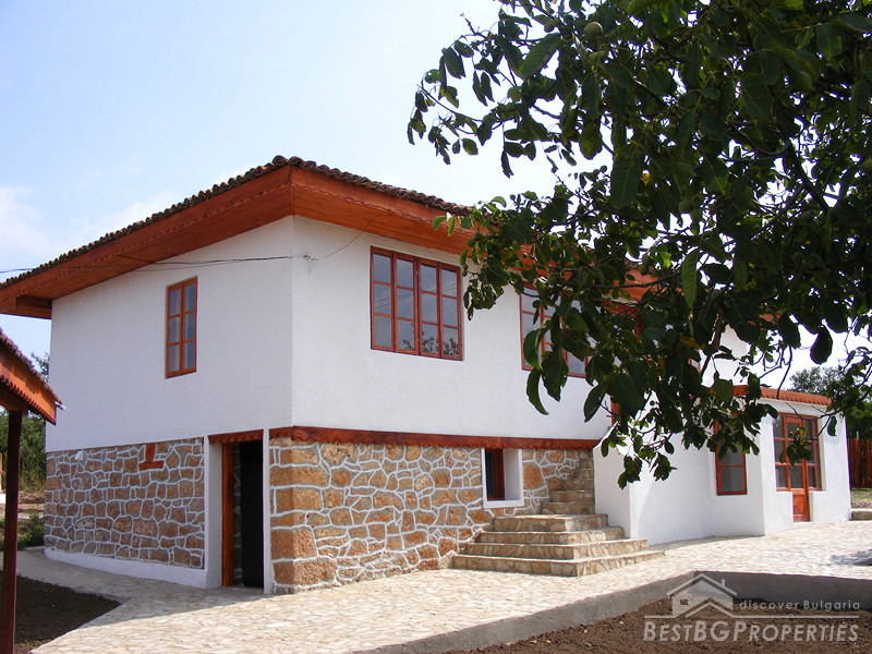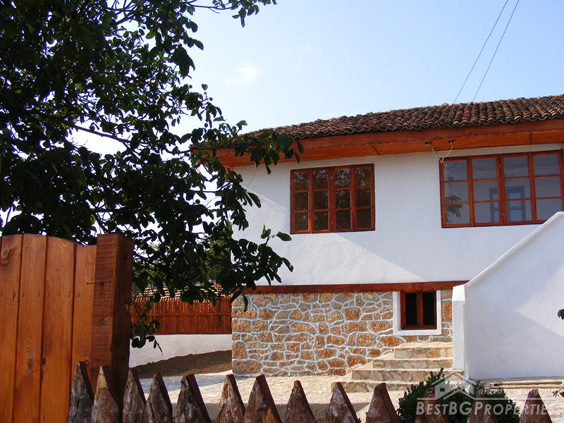 We are offering you this renovated two storey house for sale in a quiet and calm village 25 km away from the Bulgarian Black Sea coastal town Varna and 20 km away from the international airport of Varna. The property has a plot of 1447 sq m and a total living area of 207 sq m. The house, which is located in the center of the village, is exposed to the south and faces lovely hills. The first store comprises a summer kitchen, a bedroom with fire place, a large living room, a bathroom with bath tub and a toilet, as well as a corner for washing machine, storage, a barbeque and a garage. The second store comprises a living room with place for another kitchen, a covered veranda, two bedrooms, and a bathroom with toilet. Another fire place is situated in the central room. Altogether the property has seven rooms, two bathrooms with WC, two fireplaces (1 on each store), a barbeque, storage and a garage. The bathrooms and the floor on the first store are paved with terracotta and faience and are also equipped with sanitary porcelain. The floor on the second store is made of wood. The yard is surrounded by a fence made of stone and wood. Pathways of 120 sq m are spread out in the front and beside the house.