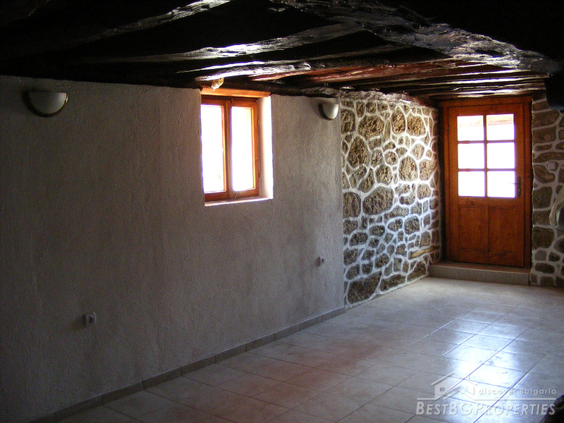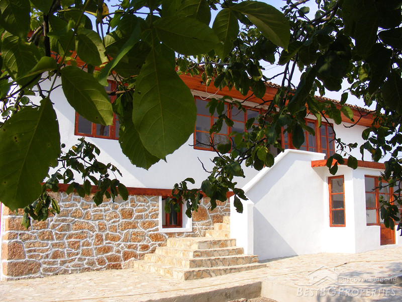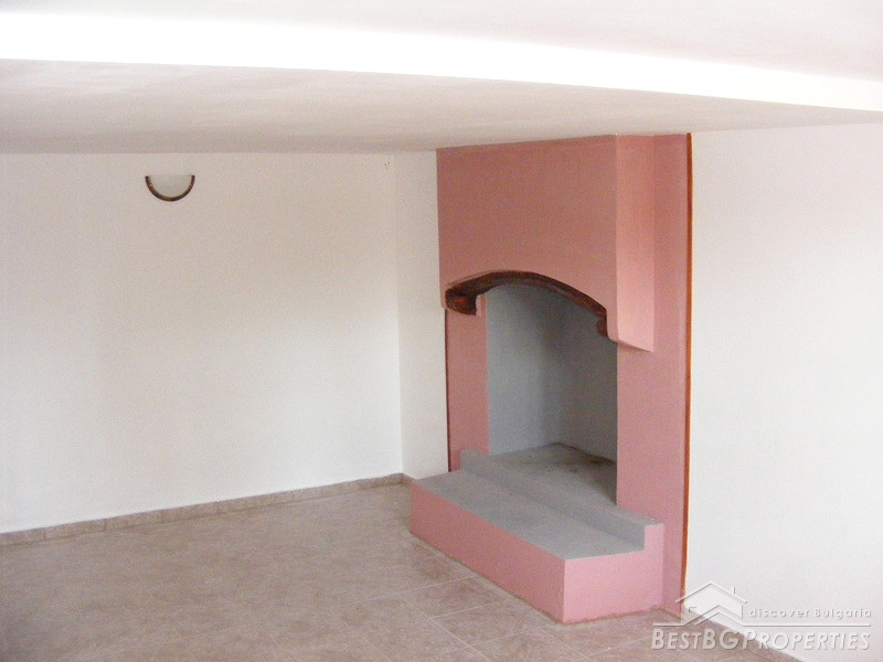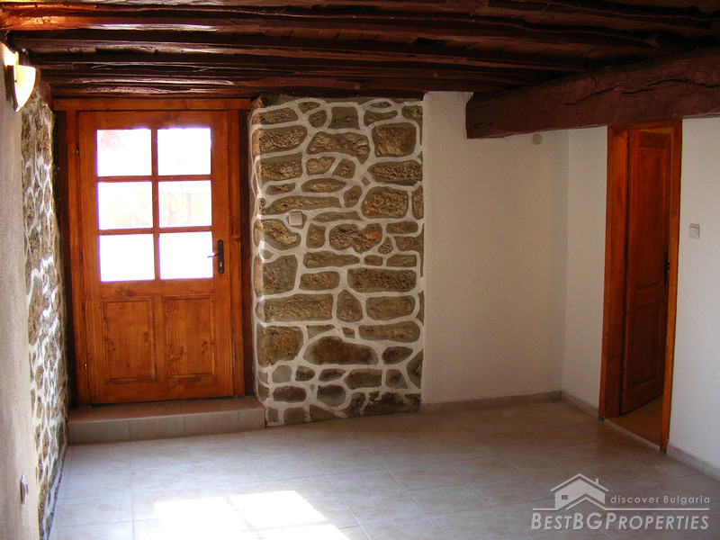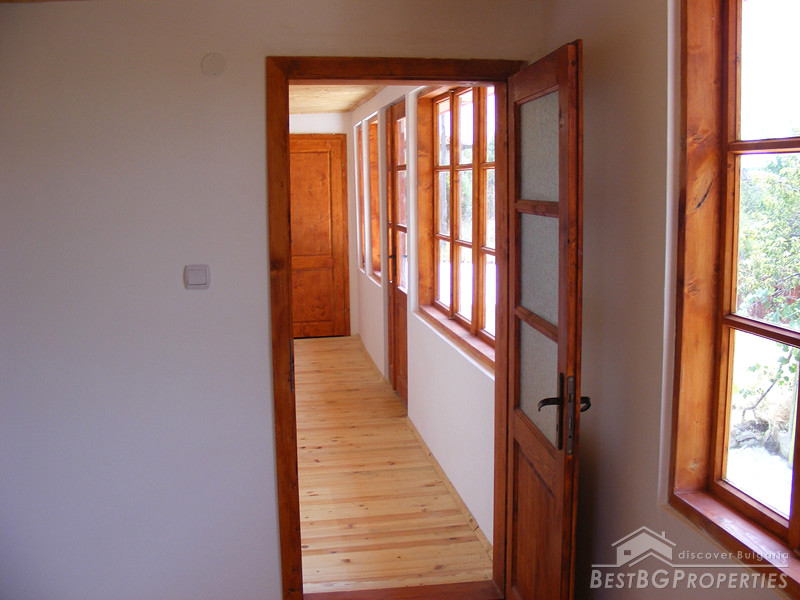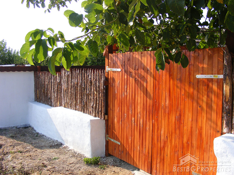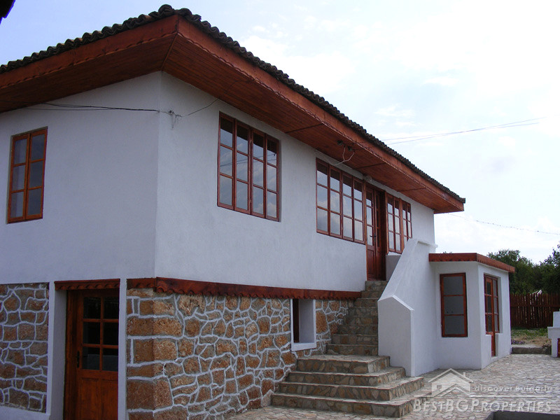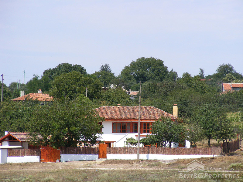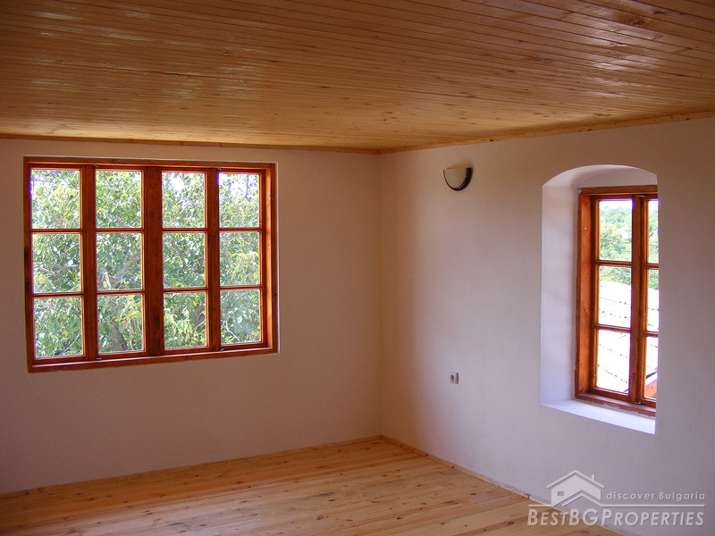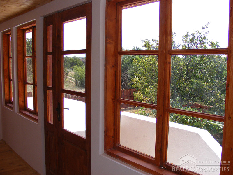 We are offering you this renovated two storey house for sale in a quiet and calm village 25 km away from the Bulgarian Black Sea coastal town Varna and 20 km away from the international airport of Varna. The property has a plot of 1447 sq m and a total living area of 207 sq m. The house, which is located in the center of the village, is exposed to the south and faces lovely hills. The first store comprises a summer kitchen, a bedroom with fire place, a large living room, a bathroom with bath tub and a toilet, as well as a corner for washing machine, storage, a barbeque and a garage. The second store comprises a living room with place for another kitchen, a covered veranda, two bedrooms, and a bathroom with toilet. Another fire place is situated in the central room. Altogether the property has seven rooms, two bathrooms with WC, two fireplaces (1 on each store), a barbeque, storage and a garage. The bathrooms and the floor on the first store are paved with terracotta and faience and are also equipped with sanitary porcelain. The floor on the second store is made of wood. The yard is surrounded by a fence made of stone and wood. Pathways of 120 sq m are spread out in the front and beside the house.