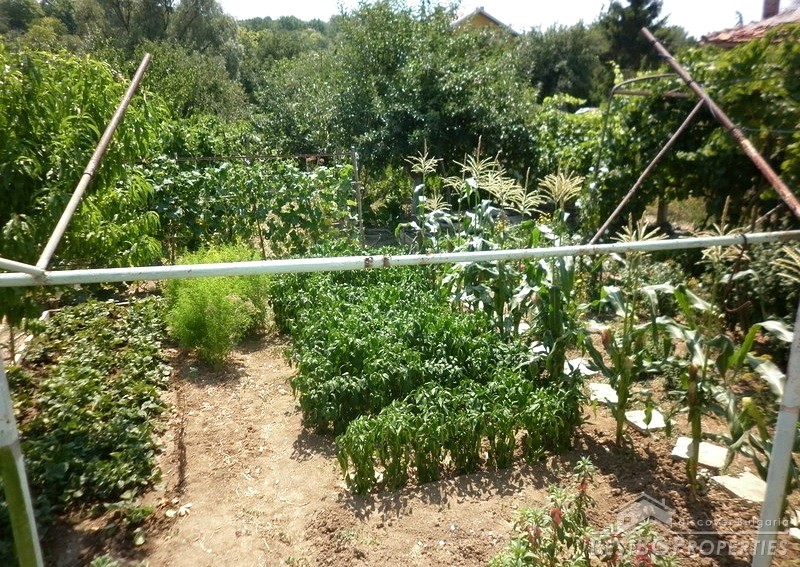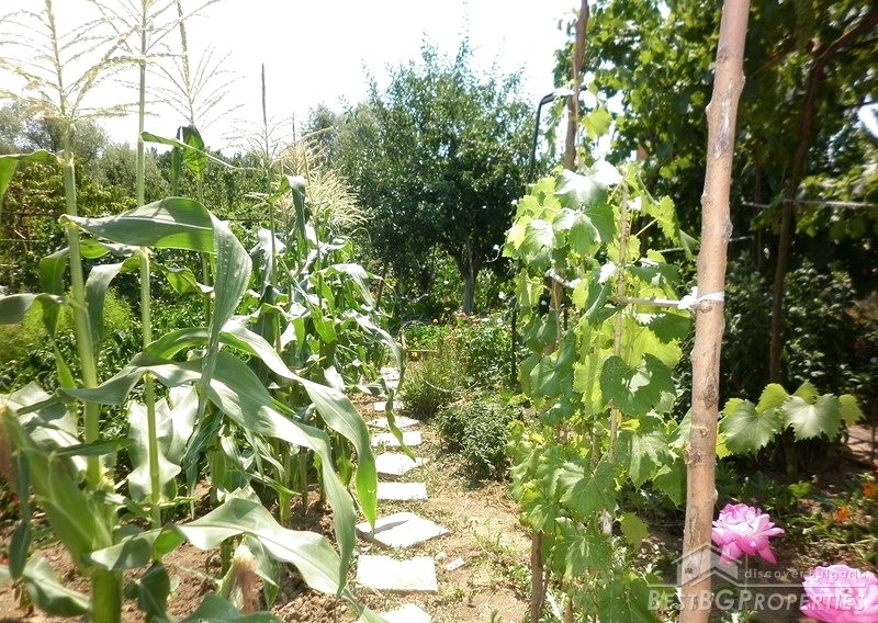 The garden is very well maintained. There are many different types of fruit trees, large vine over the entire front yard. There are lots of vegetables, shaped flower gardens. There is an outdoor fountain and a second external bathroom. In the yard there is an additional agricultural outbuilding.