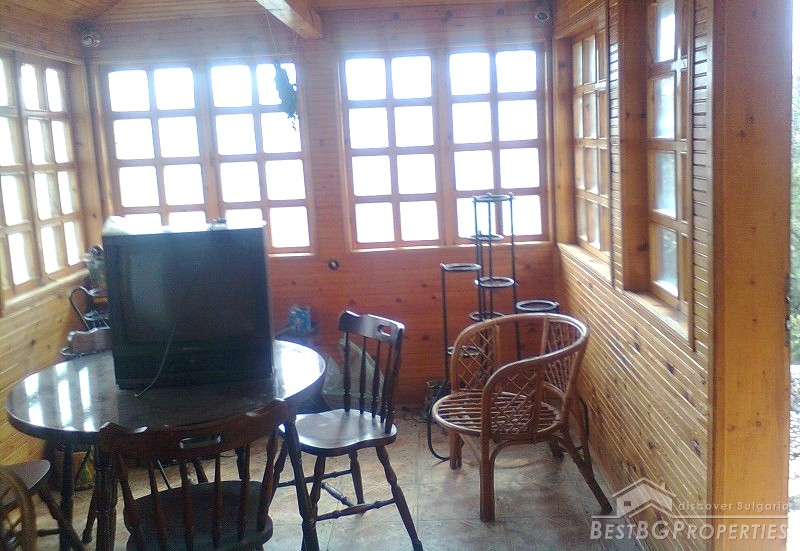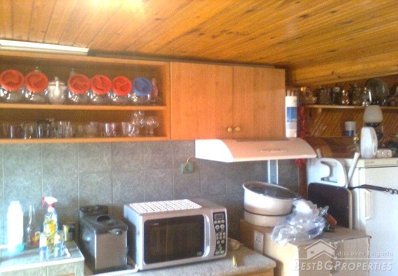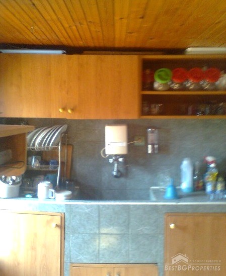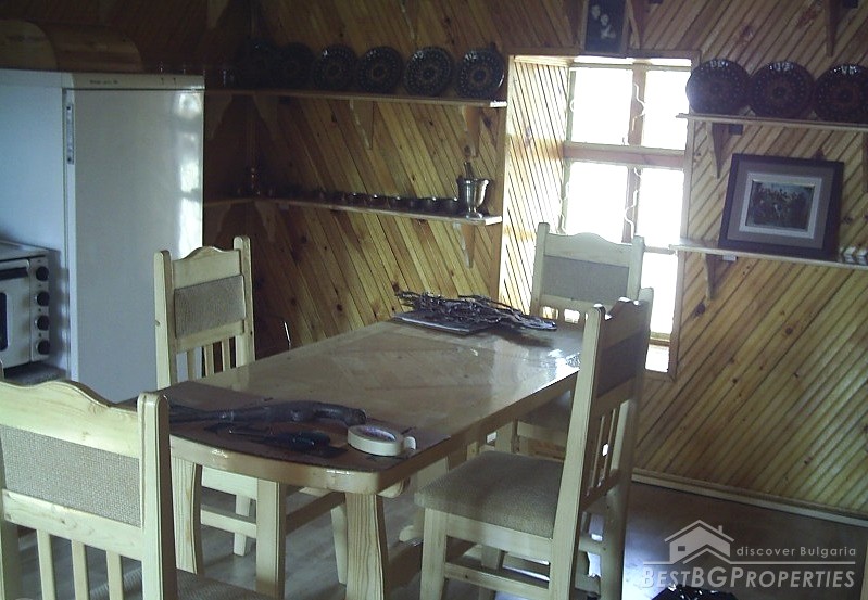 The distribution inside the house is as follows: on the first floor there is living room with fireplace and an oven. On the second floor there is a large lounge, bedroom, living room and a kitchen with sink and small boiler. Under the stairs to the second floor there is a bathroom with WC and water heater. Additionally, there is an outside toilet. The total living area is 130 sq m.