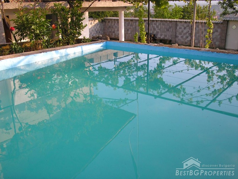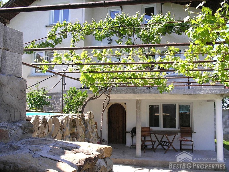 The property is large, it consists of a 3 storey house and a yard. The house has a total living area of 140 sq m. It includes 2 bedrooms, big kitchen, 2 living rooms with fireplace, bathroom. The house is finished with terracotta and faience floorings, latex painted walls. It is fully furnished with modern new furnish. The bathroom and kitchen is fully equipped. The yard is 1380 sq m in size, beautifully managed with landscaped lawns. It is surrounded by a big new wall (90m long and 2m high) which provides maximum privacy. There is also a large pool with waterfall, garage, fireplace, barbeque. Three kinds of grapes, big garden with separate fruit trees. The water supply is centralized, but there is a well with very clean water too.