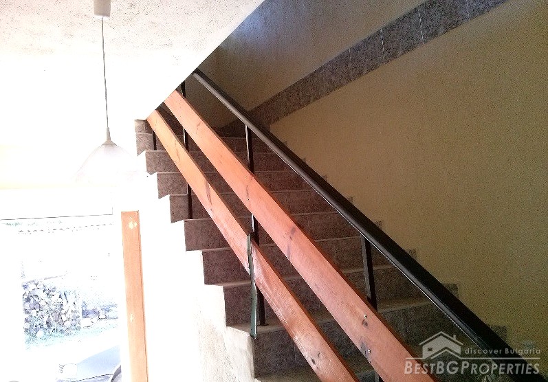 The distribution of the premises inside the house is as follows: On the first floor there is an entrance hall, living room, kitchen, bedroom, garage with inside connection to the house, bathroom and WC. There is also a terrace with exit to yard. The second floor consists of internal staircase, two bedrooms, living room with kitchen, bathroom with WC and a terrace with panoramic views. Both floors are 187 sq m each. There is a ground floor - 59 sq m with second entrance from the yard. It consists of a basement, living room and a bathroom.