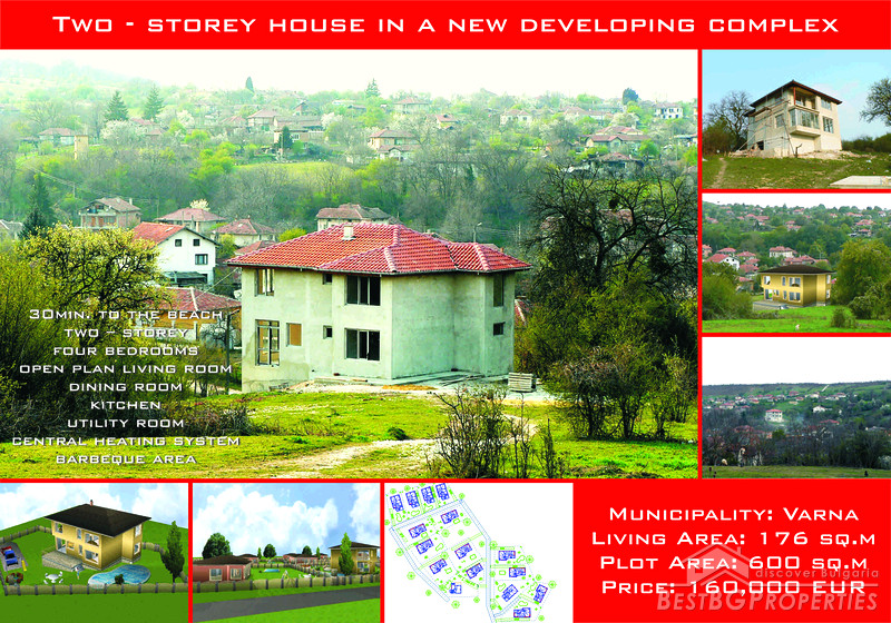 We would like to present you a new developing residential complex only 26 km from the beach and 50 km from the district center Varna.Two – storey house offering total living area of176sq.m. The first floor consists of an open plan living room/dining room/kitchen, a utility room and a WC, a spacious en-suite bedroom and patio leading out to decking. An indoor staircase leads to the second floor where 3 more bedrooms, plus family bathroom. Two bedrooms share a balcony with a gorgeous view to the area.The house will be done with UPVC double glazed windows, laminated floorings upstairs, terracotta downstairs, fitted furniture in the kitchen. Full central heating system. The yard benefits from a beautiful barbeque area as well as parking place. It could be turned into a lovely green garden. This is an excellent investment opportunity for those who are looking for the dream holiday home or a permanent residence. The property offers all the facilities required.
