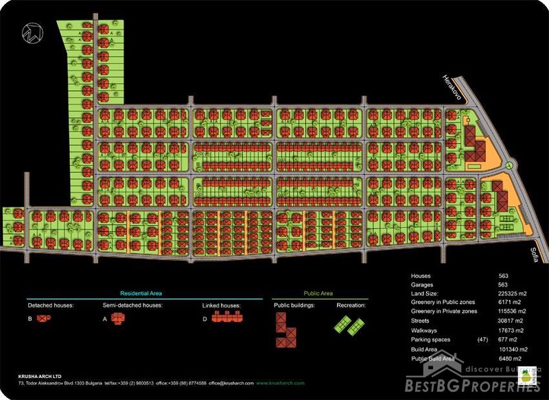 So far the developer has acquired 120,000 sq.m. of the 220,000 sq.m. earmarked for the project development at an average price of 23 Euros per sq.m. and has obtained zoning with the following parameters: Kint 1,2, density 60% and height 10 meters (3-story buildings). However, in order to leave enough open space the concept design envisages only 30% utilization of the allowed Kint. The projected sales price of the houses is between 130,000 and 150,000 Euros (at builder's finish), including the cost of the land plot.
