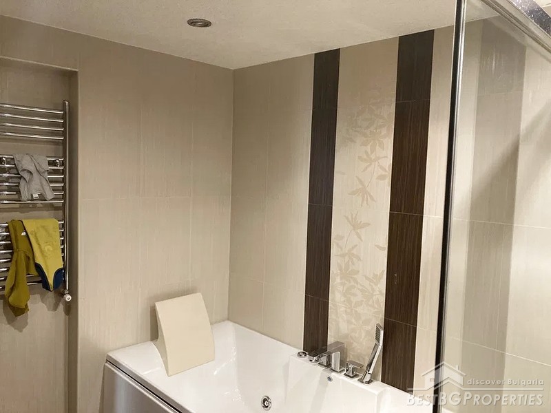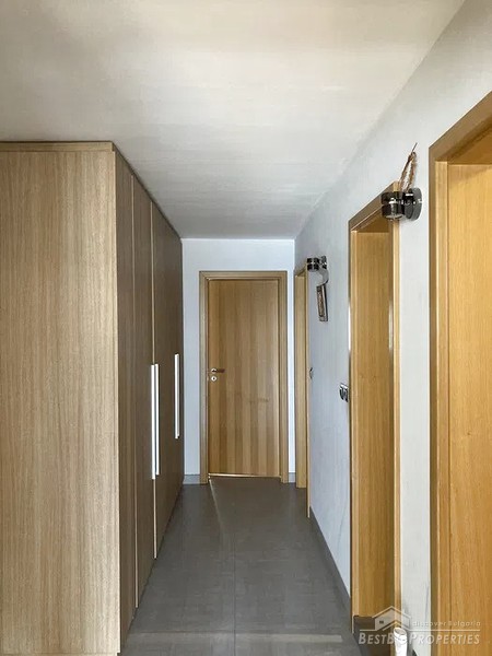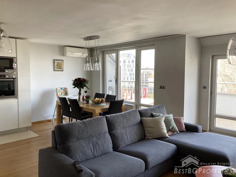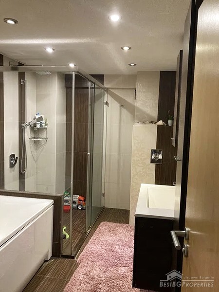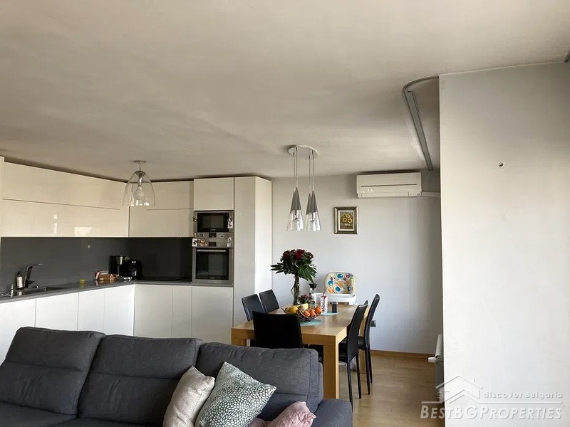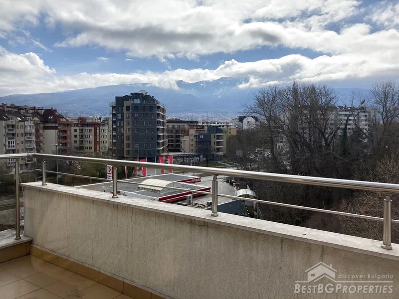 The property consists of a spacious living room with kitchenette and dining area, and a terrace overlooking Vitosha Mountain. There is a corridor leading to 2 separate bedrooms sharing a spacious terrace and two separate bathrooms with toilets and a laundry room.