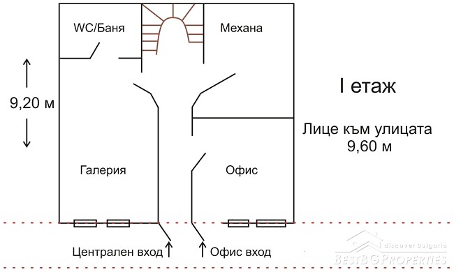 I floor - 3.80 meters high - an office with separate entrance, a tavern, gallery, WC, cellar. It has total living area of 82.4 sq m.