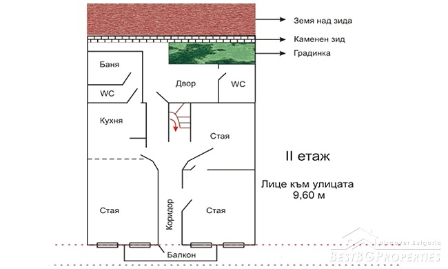This is a large house for sale, located in the town of Veliko Tarnovo. It is a semidetached house with a common entrance and hallway in the middle. It is facing the main road - 9,60 m and consists of two floors: