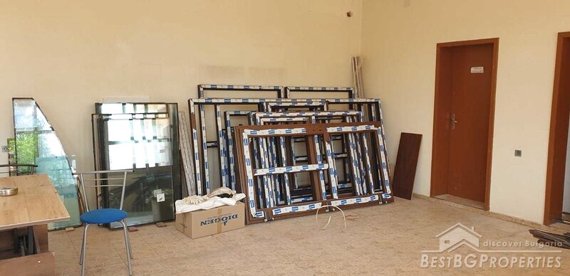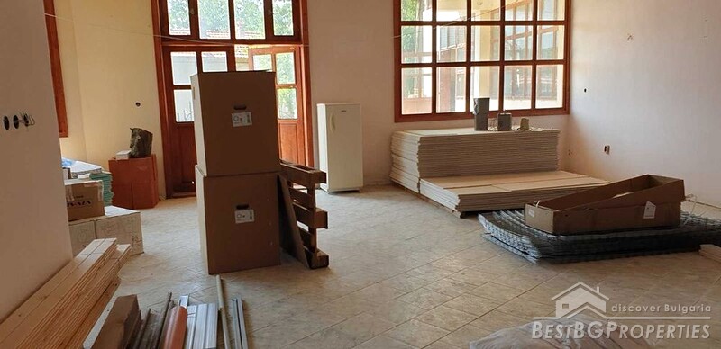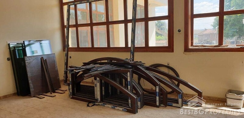 The house is on two floors and spans a total living area of about 580 sq meters. Renovation of the entire building has been started, but not completed. The first floor is plastered and has terracotta flooring. PVC joinery has been purchased but needs to be installed. On the second floor there is partially installed plasterboard, and the materials for completing the renovation have been purchased, including all the pipes for underfloor heating.