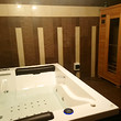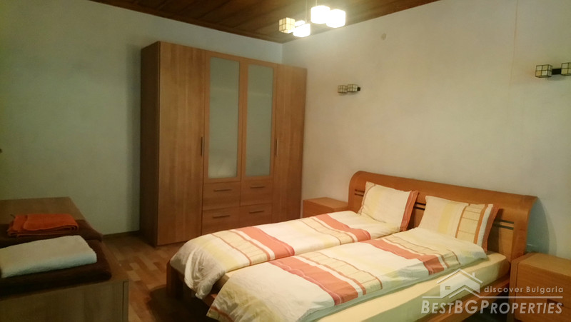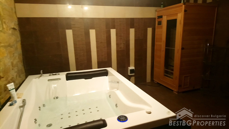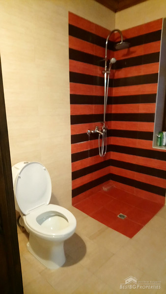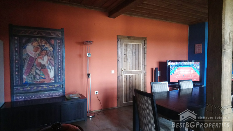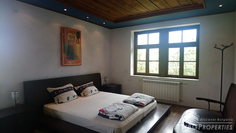 The bigger house was built in 2007. It is made of stone, wood and brick. On the first floor there is a large relax room with direct exit to the garden, a separate bedroom with bathroom and two large storages. The relax room leads to the spa room with jacuzzi. There is also a bathroom and a laundry room with washing machine and drier. The main entrance to the house is through the second floor. There is a large veranda with views over the valley, large living room 54 sq m with kitchen, dining room, sitting area with leather sofa, plasma tv receiver, fireplace. The living room leads to an office room and the office leads to a bedroom with closet and bathroom. On this floor there are also three more bedrooms with shared bathroom.