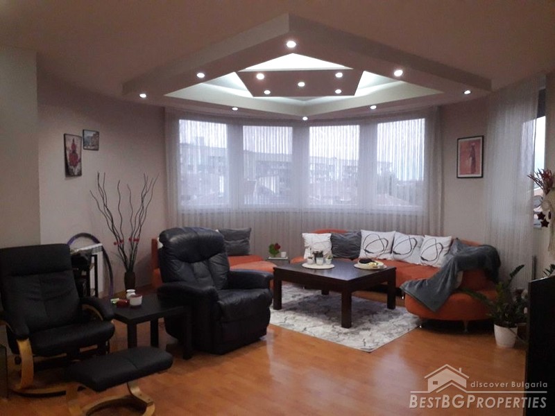 We offer to your attention a furnished apartment with a total living area of 113.2 sq m located on the fifth floor in a brick building with an elevator. The building is situated right opposite the Kronstadt park next to the Dimitar Talev school in Kichiuk Parizh. The property is sold together with a ground floor garage of 20.73 sq m supplied with electricity and water and equipped with automatic roller blinds. The price also includes a cellar of 7.8 sq m and ideal parts of the plot on which the building was built.