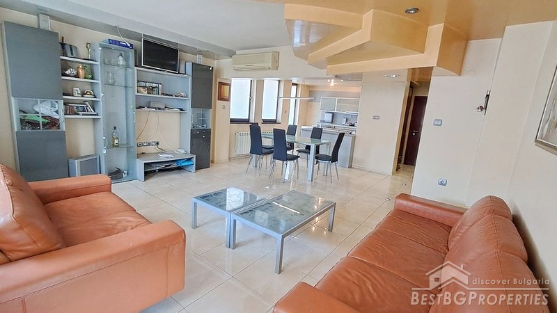 The apartment is part of a solid brick building with well-maintained shared areas and its own central heating system. The property represents a two-bedroom apartment with an area of 93 sq.m. (excluding terraces), consisting of a spacious living room with kitchen, 2 bedrooms, bathroom, toilet and two large sunny terraces.