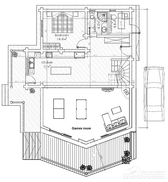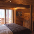 Balcony with fully open cathedral ceiling. Master bedroom with an excellent handmade king-size bed and fully fitted furniture. Double glazed French doors leading to outside balcony with views of the village and fantastic views of Pirin mountains. There is a master bathroom with enclosed corner bath, shower cubicle, bidet and WC. The guest bedroom includes double bed, built-in wardrobe. It is fully furnished and has open views to the village and mountains.