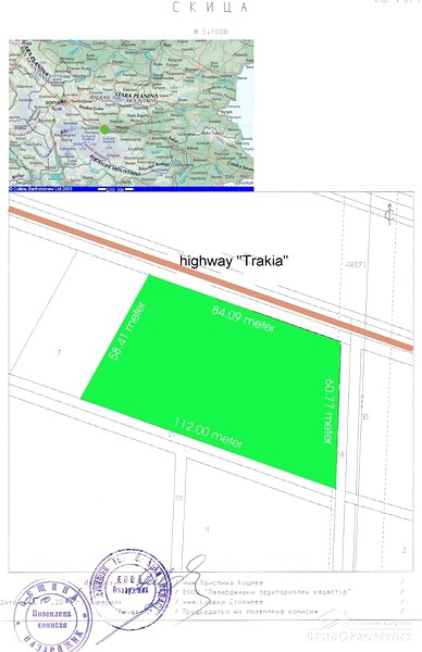 Are you interested in investing in Bulgaria in the long-run? Or you desire to establish a joint-venture or own business in this promising country. Our next offer is for those who are looking at large scale projects. This is a plot of land exactly at the Motorway A1 that links Sofia with Burgas. The motorway will be fully finished in 2009 and will provide quick access from the capital to the sea side. Intensive building works are going at the moment. However the plot we suggest is on the already existing part of A1. Its size is 5 670 sq m and it has direct access on the road. There is a possibility for an exit there. The land is on the southern side of the road on direction towards Plovdiv and Burgas. The size is suitable for building a Petrol/Gas Station, restaurant, motel or a rest area. Closest service point is a petrol station at 10 km. There is an electric outpost at immediate proximity. Nearest town is Pazardzhik at 9 km. There is a village at 4 km too; this means labour force is quite easy to be found here. If you are interested in this offer, feel free to ask for more information. Our agents can also show you the lot upon your request. The company offers legal assistance for acquiring a building permission.