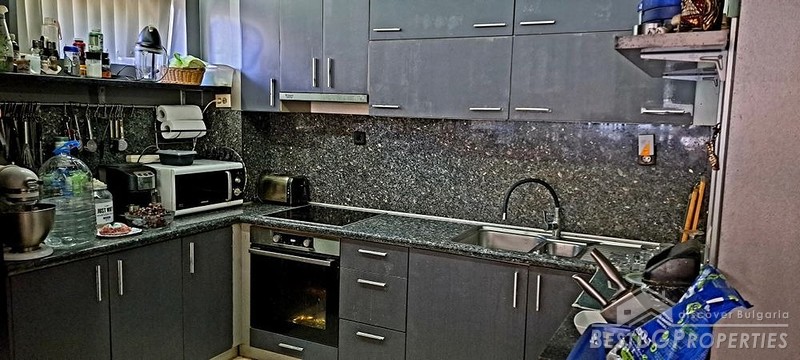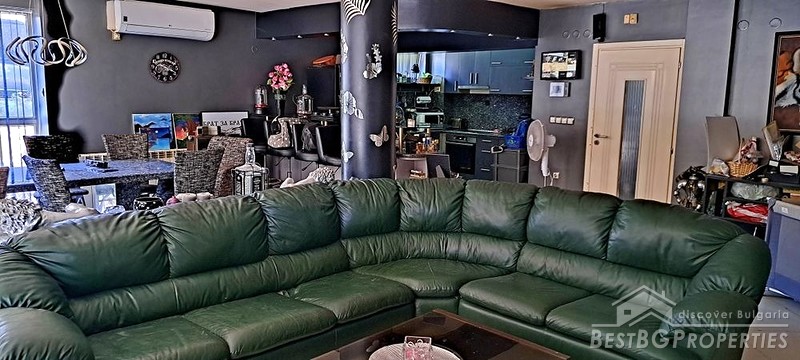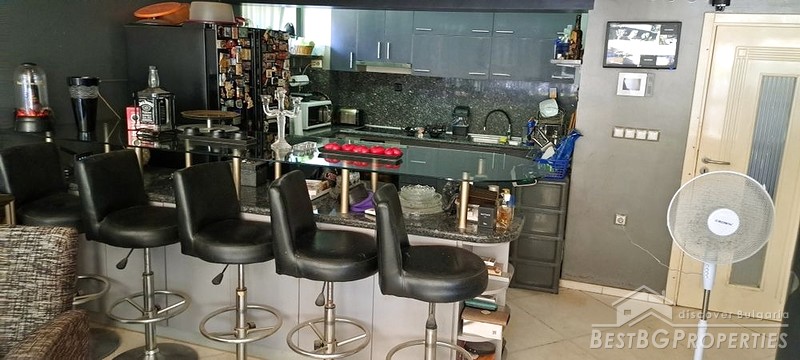 - Large living room with sofas, TV, aquarium, granite table, bar counter with cabinets, kitchenette with cabinets, double-door refrigerator, bar stools, built-in oven, ceramic hobs, microwave, extractor hood, large fireplace made of Vratsa stone, air conditioning, 2 radiators.