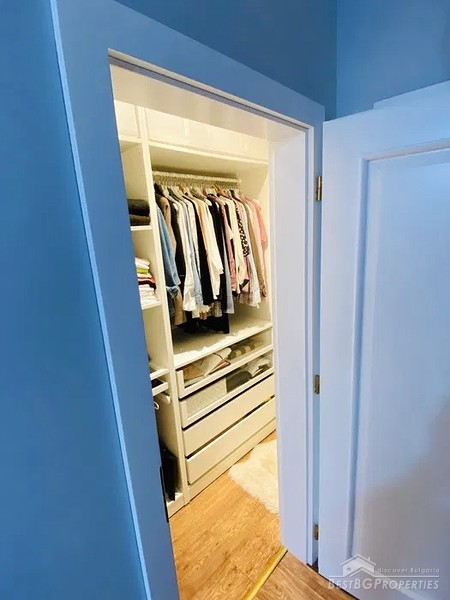 The property is functional, spacious, luxuriously furnished and fully equipped with high class appliances. It consists of a large entrance hall, a spacious living room (40 sq m) with a beautiful kitchen, a sunny dining room and a seating area, two spacious bedrooms, (15-16 sq m), wardrobe, a bathroom with a toilet, a separate toilet, two balconies with beautiful views.
