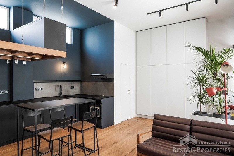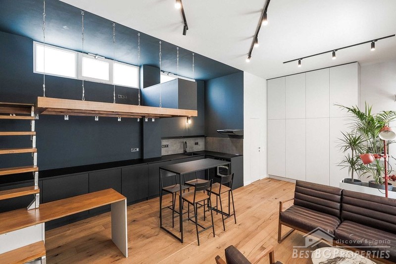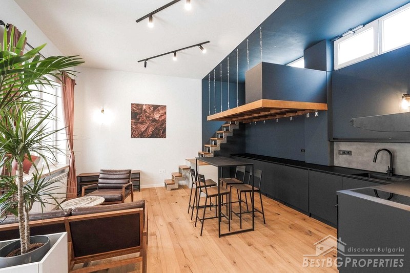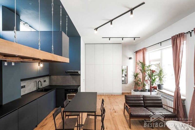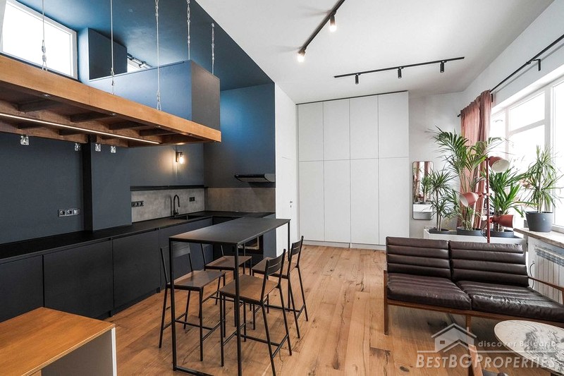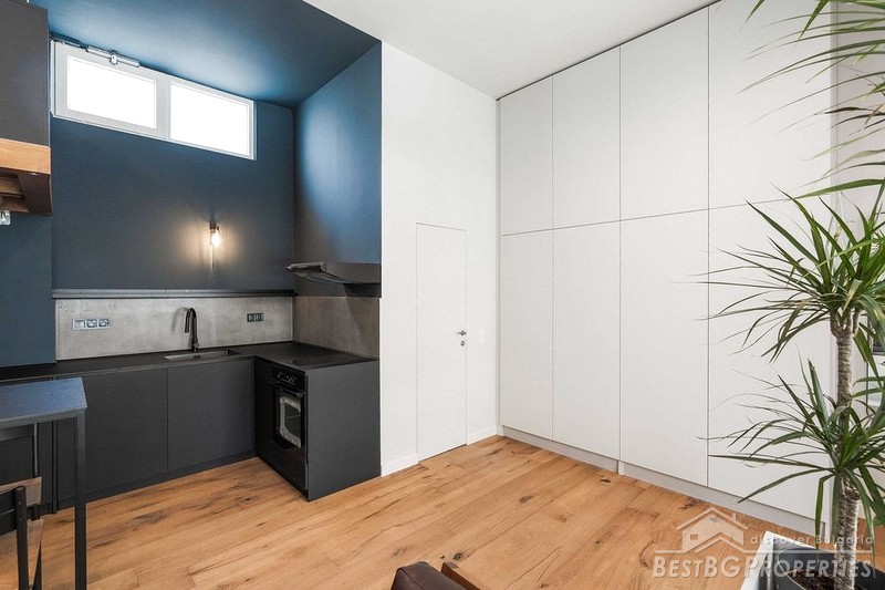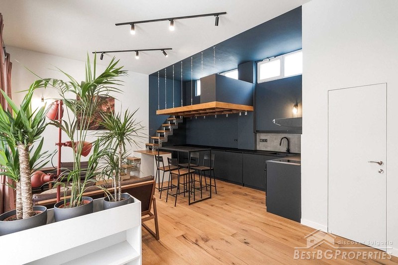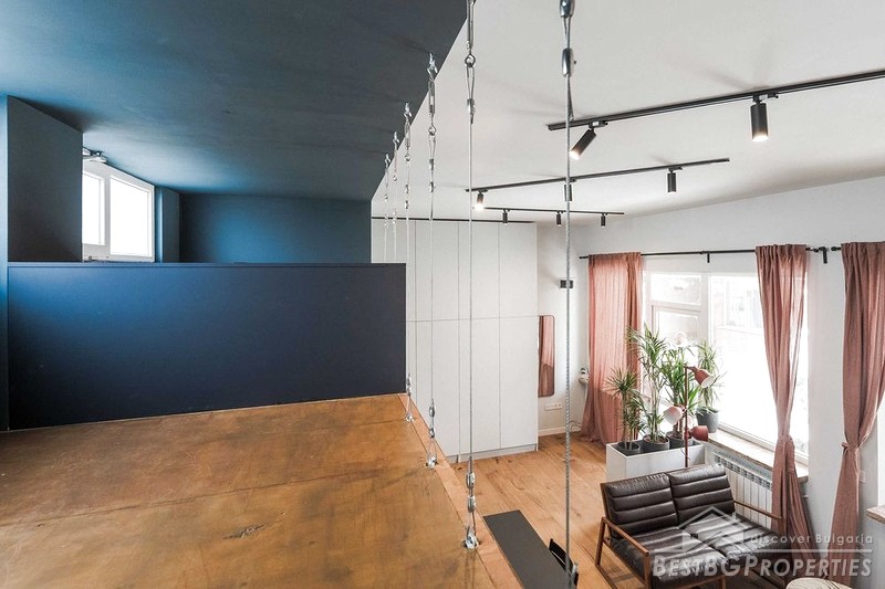 The studio features a very high ceiling which in combination with the large windows create a feeling of spaciousness and comfort. The loft also features a second level that has been built for a bedroom or relaxation. The flooring is three-layer parquet. There is a custom kitchen and very a large MDF wardrobe. The studio is fully furnished and equipped with built-in appliances, dishwasher, washing machine and refrigerator.