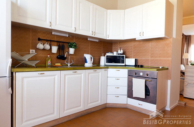 The apartment consists of 2 bedrooms, large living room, and fully equipped kitchen with integrated appliances (washer dryer, dishwasher, etc.) There are two bathrooms - one with bathtub and shower and the other with shower. The apartment has two balconies – south facing towards the inner yard and north facing towards Dondoukov. One of the bedrooms overlooks the inner yard and it is very quiet with access to the south terrace. The other bedroom overlooks Dondukov Boulevard.