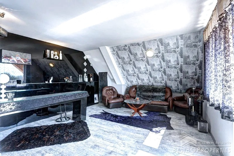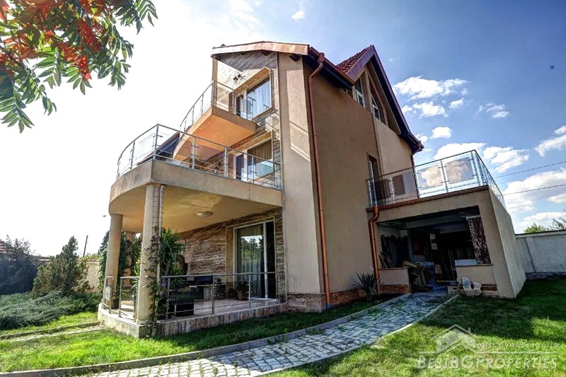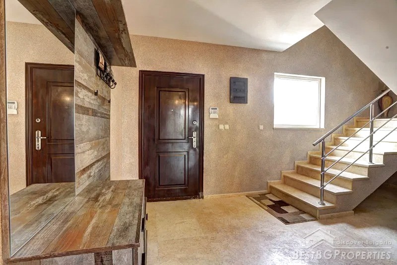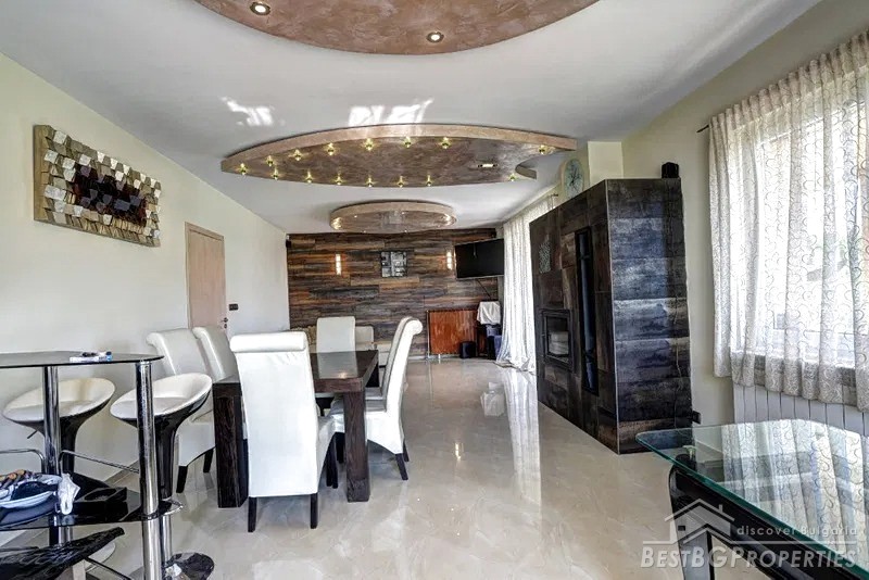 The house was built in 2010. It has Act 16 permission for usage. It is red brick construction with 15 cm thermal insulation, scratched plaster, clay tiles, Rehau windows, 3-phase electricity, security system, automatic garage door, drinking water, sewerage and so on. For the heating there is a fireplace connected to a 30-kw water jacket and aluminum radiators. There are designer railings, floors and stairs - Egyptian marble, walls - mineral plaster.
