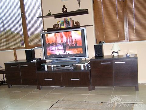 On the 1st floor there is big living room with white leather-ended couches, low height furniture, cable TV, plasma TV, home cinema, and fireplace, kitchen with dining room for 6 persons, bathroom and toilet.