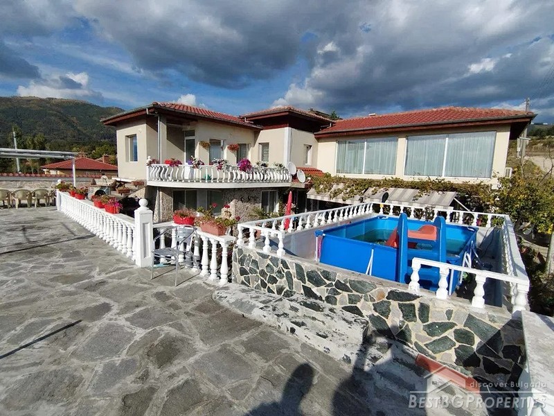Luxurious two-storey house located in a village 12 km from Kazanlak. We offer to your attention an incredible two-story house, with a built area of 500. The house is on two floors - 180 sq m and 140 sq m respectively. Adjacent to the house there are also some storage rooms that can be converted for living. The property has a garden of 400 sq m. The house has the following layout inside: First floor - 180 sq m - consisting of a living room with a kitchen, 2 spacious bedrooms, a bathroom with a toilet, a large and a small corridor and a room intended for a wardrobe or a closet. There is also a storage room where the pellet boiler is located and space for storing up to 8 tons of pellets. Adjacent to the house there is a garage that has been converted into a studio consisting of two rooms, but could easily be converted back into a garage again. Each room is furnished with a lot of style, and with the idea for maximum functionality. The living room is spacious and light, which gives a feel of coziness and warmth. Second floor - 140 sq m - consisting of a living room with kitchen and dining room (total of 80 sq m), two spacious bedrooms, a corridor and a large bathroom with toilet. This floor has been specially designed with large windows to take in as much light as possible and reveal spectacular views. This floor also has three terraces from where you will be able to enjoy the incredible sunsets. The entire second floor is furnished with luxury furniture according to an individual design. It is equipped with the highest class of energy-saving electrical appliances. The apartment is finished with lots of taste and quality materials. The house is sold fully furnished and with all the equipment. There is a small pool and barbecue. |