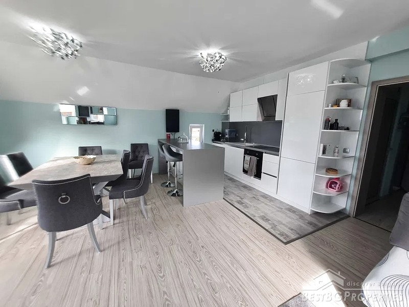 For sale is a new, brick apartment on two levels, with a total living area of 125 sq m. The apartment is facing south. It is situated on the third floor of a 3-storey residential building. The second level is a huge roof-top terrace with an area of 65 sq m. The terrace has 365 degrees views of the three surrounding mountains - Belasitsa, Ograzhden and Pirin.