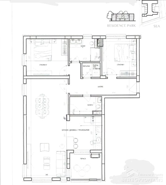 The property benefits with incredible panorama of the sea, Burgas, the International airport and Stara Planina Mountain. The exhibition is towards south, west and north. It consists of two bedrooms, two bathrooms, a spacious living room with kitchen and dining area, a wet room and a large terrace.