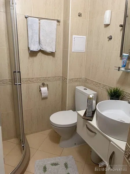Both bathrooms are fitted with shower cabins. The living room is equipped with a fireplace. All rooms have French convector heaters Aerlek with thermostats (5 pcs.). There are air conditioners (4. pcs.). The kitchen is equipped with kitchen cabinets, a ceramic hob, oven and a dishwasher. The apartment also has 2 closets and 4 terraces (two of which are glazed).