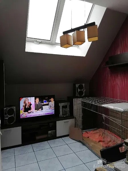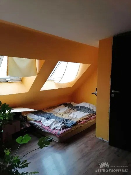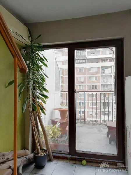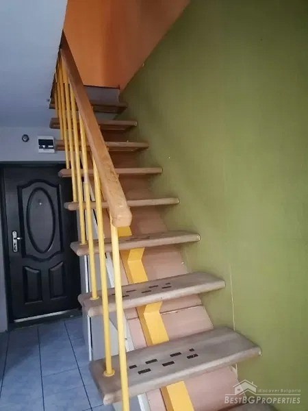 The apartment is on two levels (maisonette typoe). The distribution of the rooms inside is very functional. On the first level there is a kitchenette (kitchen cabinets are included in the price) and a living room, exit to a large balcony. There are stairs to the second level. Under the stairs there is an additional space used for a closeт. In the second floor there is a bedroom and a separate bathroom and toilet. There is a possibility to move the toilet to the bathroom and use the space.