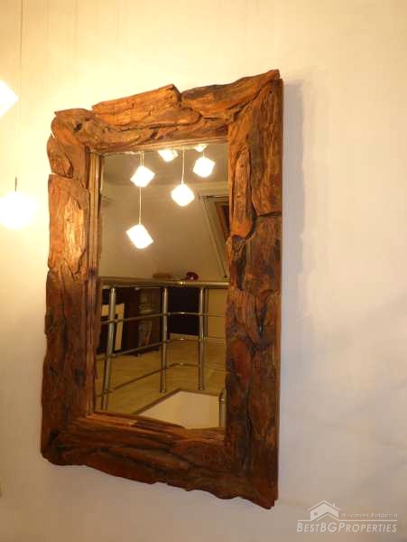 The maisonette consists of two floors. First floor - lounge with bathroom, staircase, wardrobe for clothes, shoe rack and a washing machine. There is a living room and kitchen and a terrace. Both have ceiling lighting and Spanish tiles. There is also a decorative wall with a fireplace, digital TV, air conditioning. The kitchen is equipped with built-in refrigerator, dishwasher, oven, etc. The second floor comprises of a bedroom with lifting mechanism, wardrobe and cabinets, library and TV area. There are two supporting columns decorated with stone.