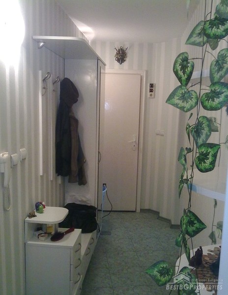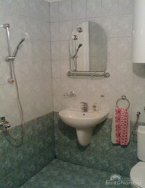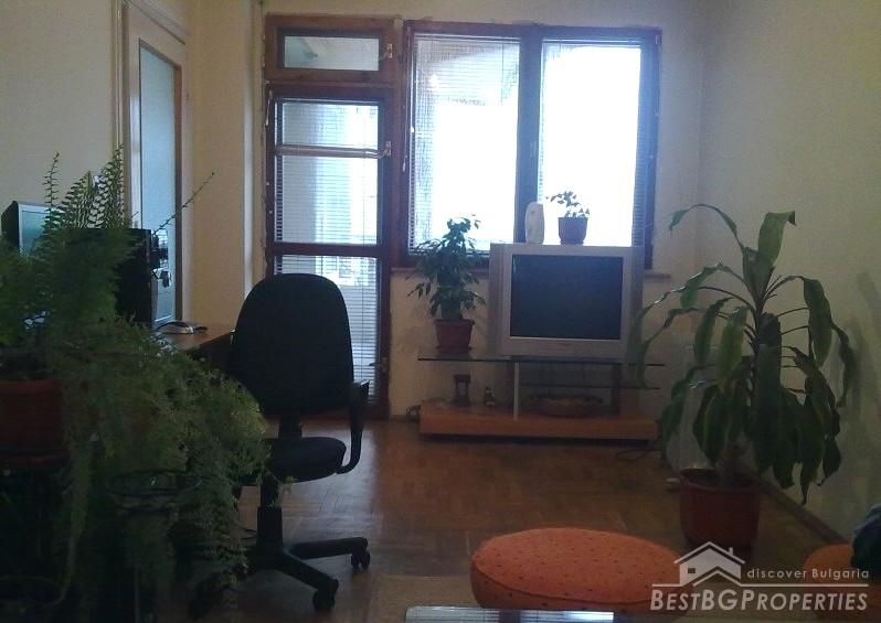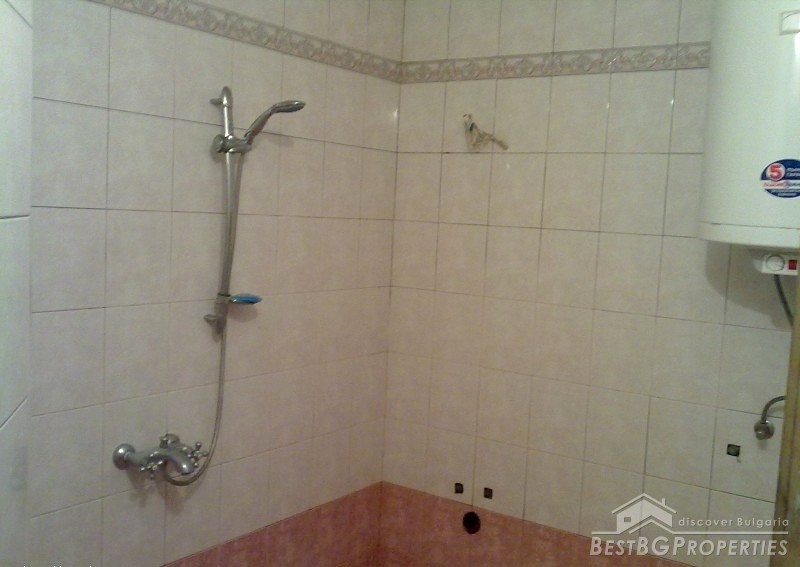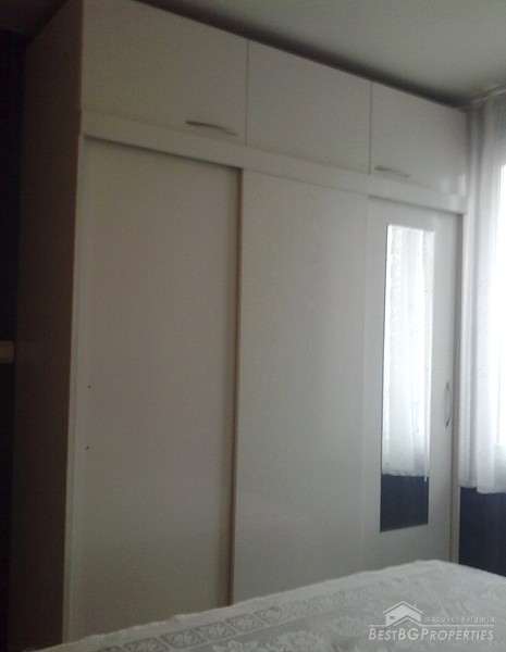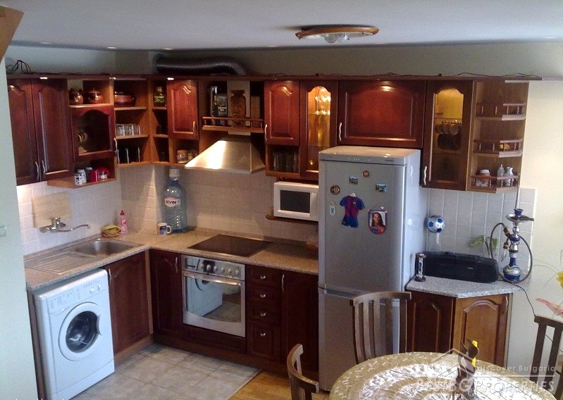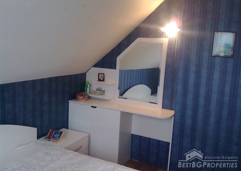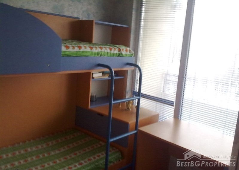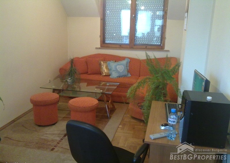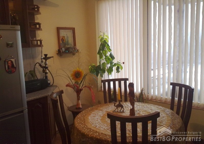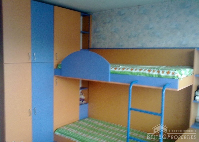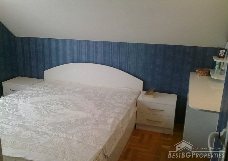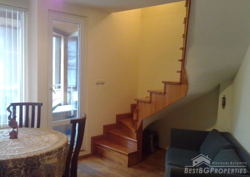 The apartment is fully south facing, and the price includes full furnishing and also part of the parcel. It is a maisonette type of apartment which means it has two levels. The first level consists of a living room, bathroom, balcony, kitchen with spiral stairs to the second level. The second level comprises of an entrance hall, bedroom, children's room, balcony and a bathroom. The apartment also comes with a basement premise. The total living area of the maisonette is 105 sq m. It is situated on the third and fourth floors of a residential building. The floorings are parquet, terracotta, and the stairs are completely from solid wood.