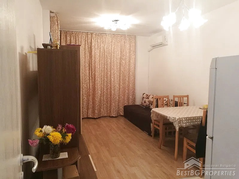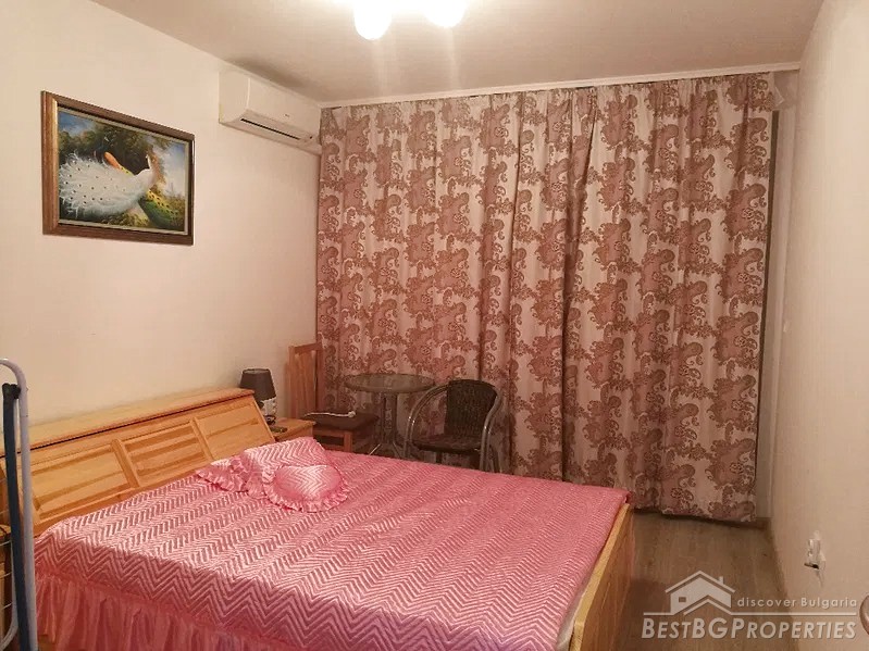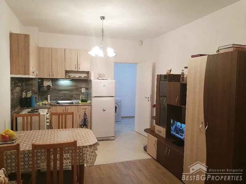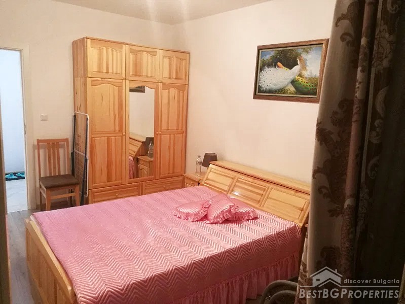 The apartment consists of a bedroom, a living room with a kitchen (the bedroom and the living room share a spacious terrace), and a bathroom. The bedroom is furnished with solid wood furniture. The living room has a comfortable sofa bed for two persons, a TV. The kitchen is fully equipped with refrigerator, stove, screen. The terrace provides a beautiful view of Sredna Gora.