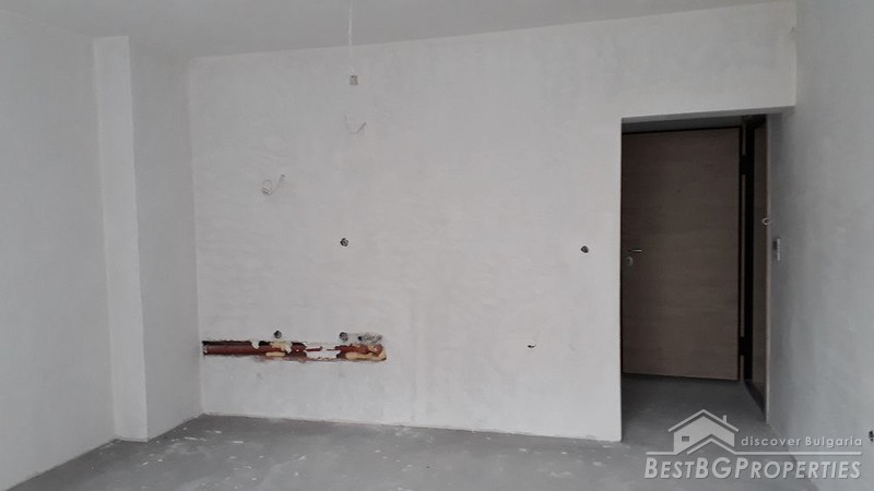 The apartment is entirely south facing. It requires final finishing. Currently it has the walls are plastered, installed piping, screed floor, installed thermal insulation - 10 cm, 5-chamber PVC windows, installed armored front door, video intercom, wiring with optical cables for the TV and internet, the security system, and the air conditioning.