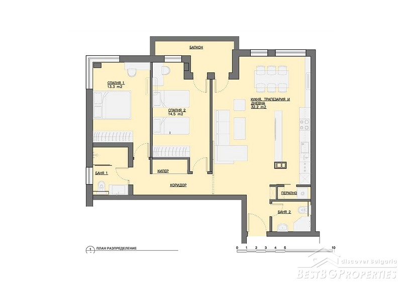 Open plan living room with dining area and kitchen - 32 sq m and an exit to a balcony, a laundry room, a closet with boiler installation, 2 bathrooms – one with a toilet, 2 separate bedrooms of 14 sq m, a separate underground basement.