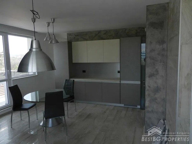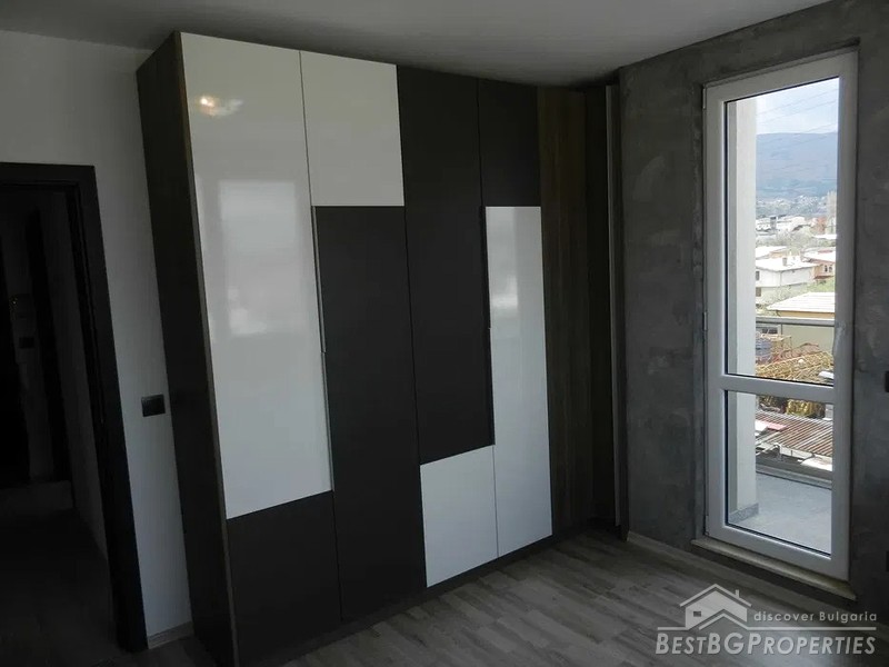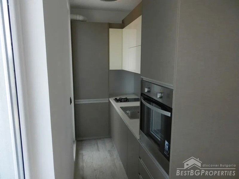 The exposure is towards southeast and northwest. The apartment consists of a spacious living room and a kitchen of 36 sq m, two bedrooms of 12 sq m each, a corridor and a bathroom with WC. The finishing is turnkey - decorative plaster, quality Italian flooring, German gas boiler – Dieterich. The apartment is fitted with custom furniture 'Metron' and high-class electrical appliances.