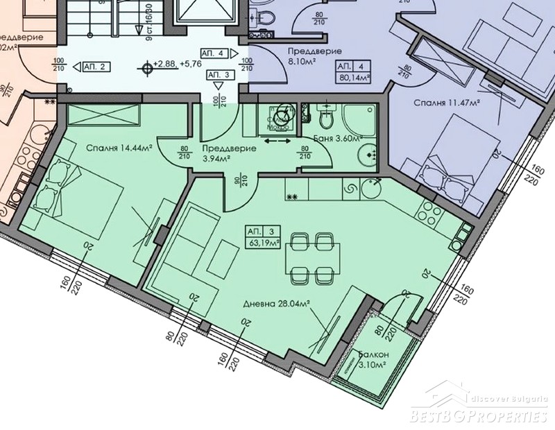 We bring to your attention a spacious two-bedroom apartment located in Malinova Dolina district of Sofia. The apartment is on the second floor of a brand-new building. It has southeast exposure and a total living area of 74.20 sq m including the shared parts and a clean-living space of 63.19 sq m.