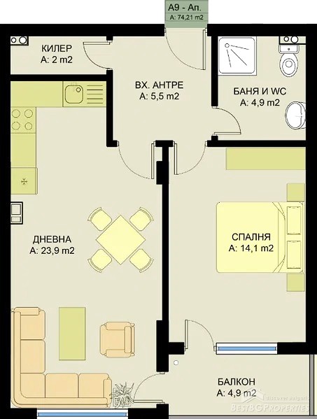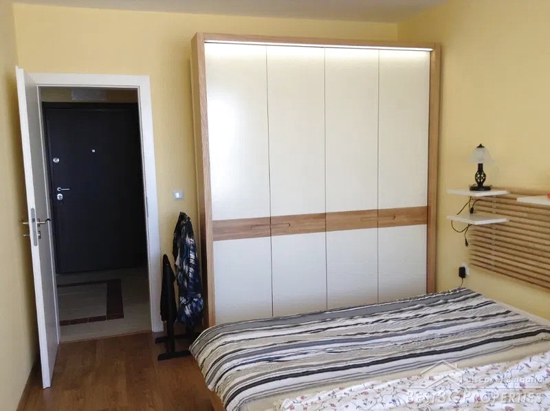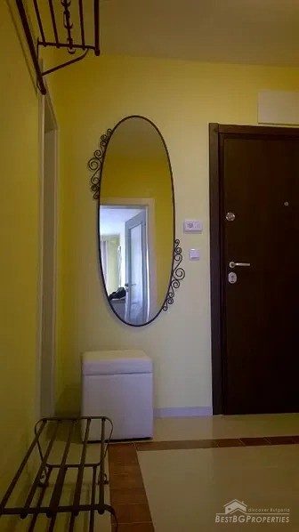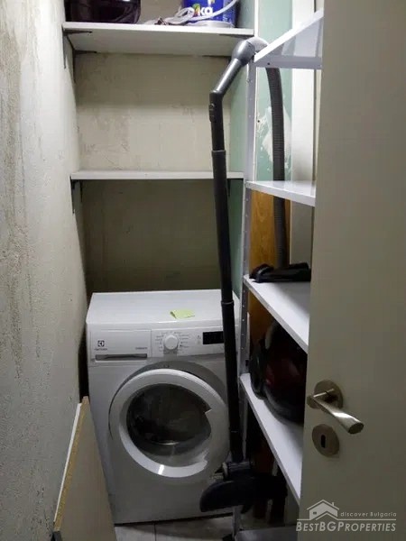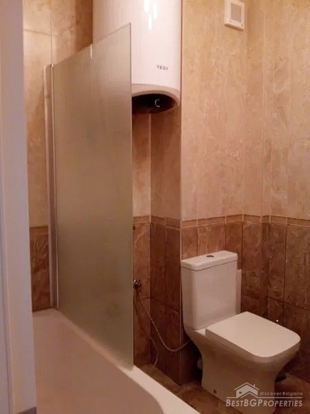 The apartment comes fully finished and furnished. There is thick exterior isolation and PVC window joineries, all electrical appliances – washing machine and dishwasher, LG fridge, dinning furniture, vacuum cleaner. The floors are finished with laminate.