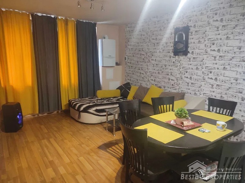 The apartment consists of an entrance hall, a living room with dining area and kitchenette, a bedroom, a children's room, a bathroom with toilet and another toilet. The finishing is turnkey. The floors are made with granite, terracotta and laminate. The walls and ceilings are painted. The bathrooms and toilets are finished with terracotta and faience. Quality sanitary ware and water taps were installed. There are five-chamber PVC colored windows, MDF interior doors and solid front door. The heating is via gas with installed boiler and aluminum radiators. There is security system, cable TV and internet.