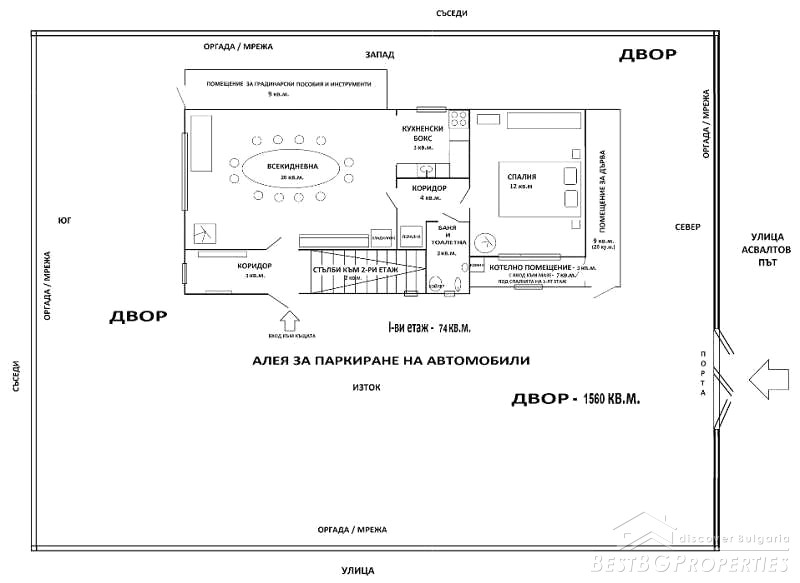 The size of the yard is 1560 sq m. In it, there is a parking space for at least five cars, 20 fruit trees and enough space for agricultural crops and / or swimming pool.