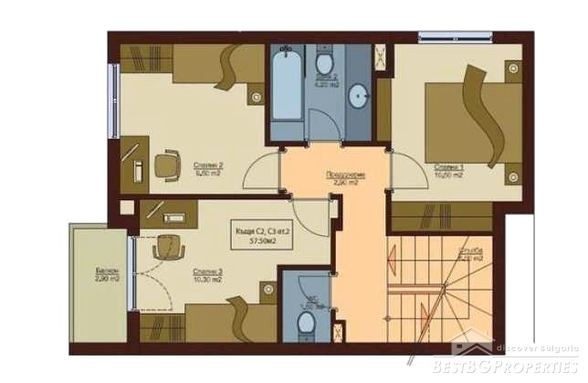 Second floor (57.50 sq m): entrance hall (2.90 sq m), bedroom (10.60 sq m), bedroom (9.60 sq m), bedroom (10.30 sq m), bathroom (4.20 sq m), toilet (1.50 sq m), staircase (6.8 sq m) and a balcony (2.90 sq m).
