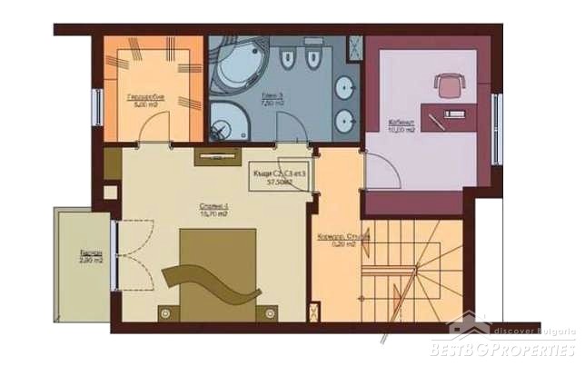 Third floor (57.50 sq m): office (10 sq m), bedroom (15.70 sq m), wardrobe (5 sq m), bathroom (7.50 sq m), corridor, staircase (8.20 sq m) and a balcony (2.90 sq m).