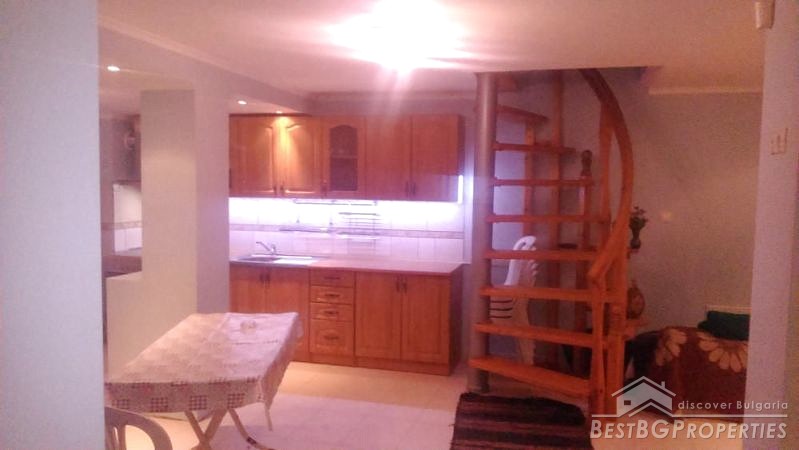 First floor - large living room with kitchen (white stone floors, latex painted walls), bedroom (laminate flooring, latex painted walls), bathroom with toilet (faience and terracotta).