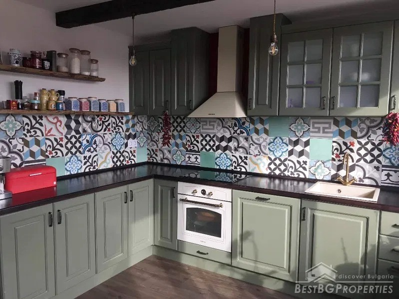 The kitchen is modernly equipped, finished with natural wood and handmade tiles. The floors are made of Italian granite, laminate - 12 mm. The walls are plastered and painted with latex. The ceilings are made of plasterboard and cotton wool. The bathroom and toilets are completed with Italian faience and decorative plasters.