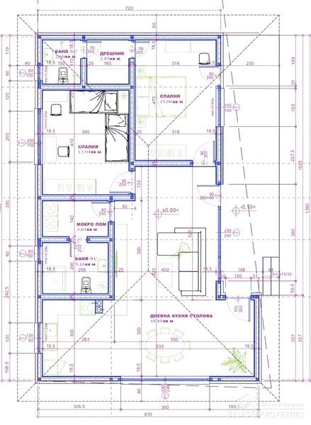 The house is almost finished. It consists of a spacious living room with kitchenette - 50 square meters, wet room a bathroom and a toilet, two bedrooms of 15 square meters and 18 square meters. The master bedroom also has an en-suite closet and a bathroom. There is also a large veranda of 30 square meters.