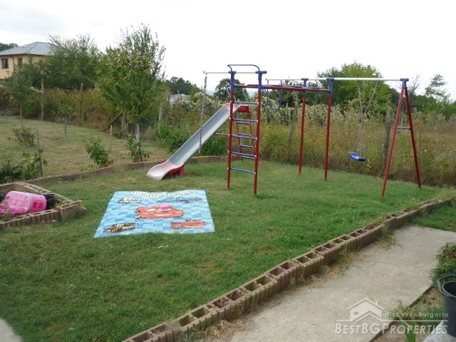 The plot has an area of 1200 sq m. In the yard, you will find a small vegetable garden (tomatoes, cucumbers, pepper, peppers, strawberries, potatoes, etc.), a children's playground and a large orchard with fruit trees (apple, pear, cherry, peach, apricot, cherry, blue plum, raspberry, currant, quince, hazelnut and walnut).
