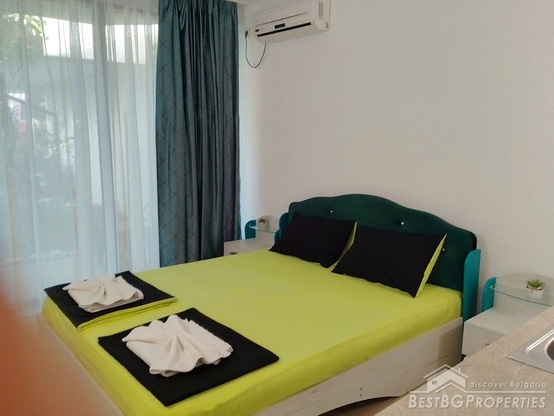 The studio is sold furnished. It is equipped with a comfortable boutique bed featuring an orthopedic mattress. There is also air conditioning, a refrigerator with a freezer, and a TV for your convenience.