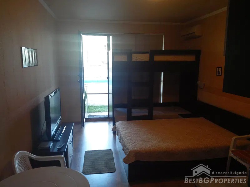 The studio is located in a quiet and peaceful place at about 300 meters from the beach. It is sold fully furnished and equipped - two beds (one on two levels), a large wardrobe, kitchenette with a refrigerator, washing machine, built-in electric hob, microwave and more. There is a fully equipped bathroom with a boiler, a sink, toilet, shower, and a mirror cabinet.