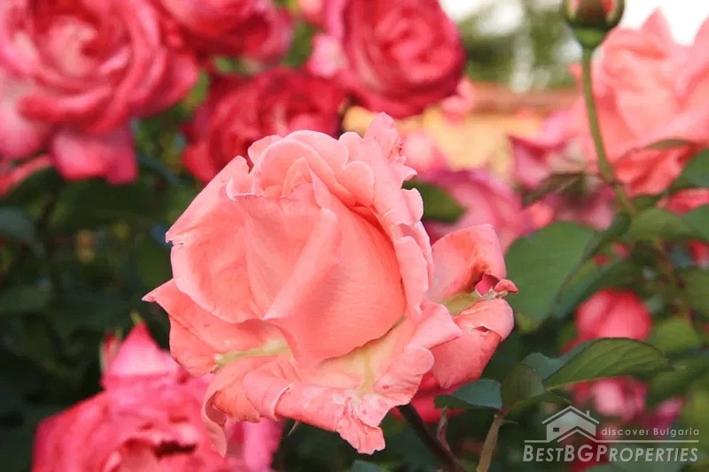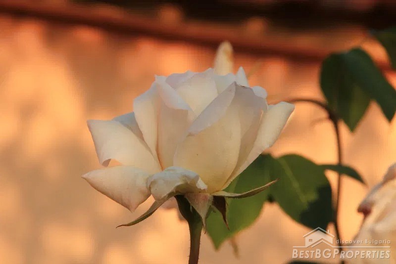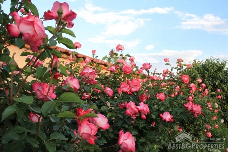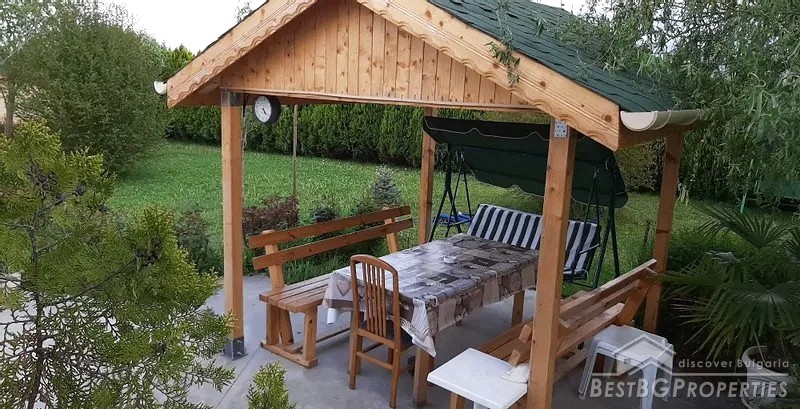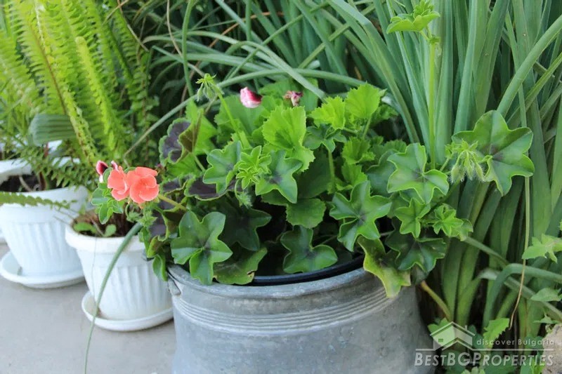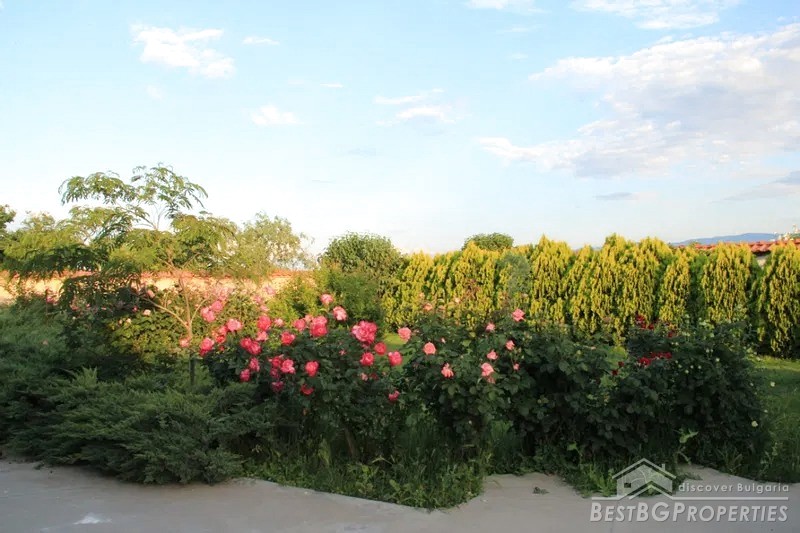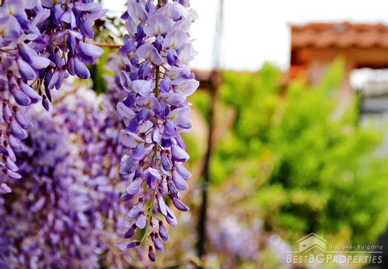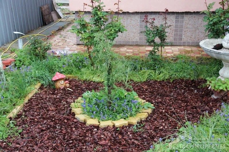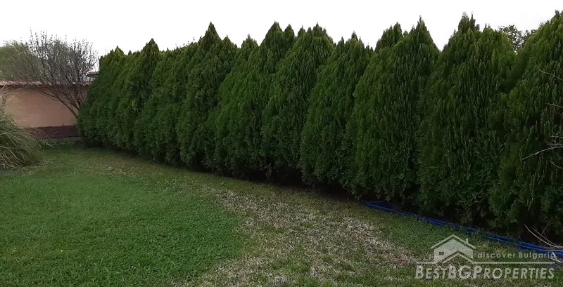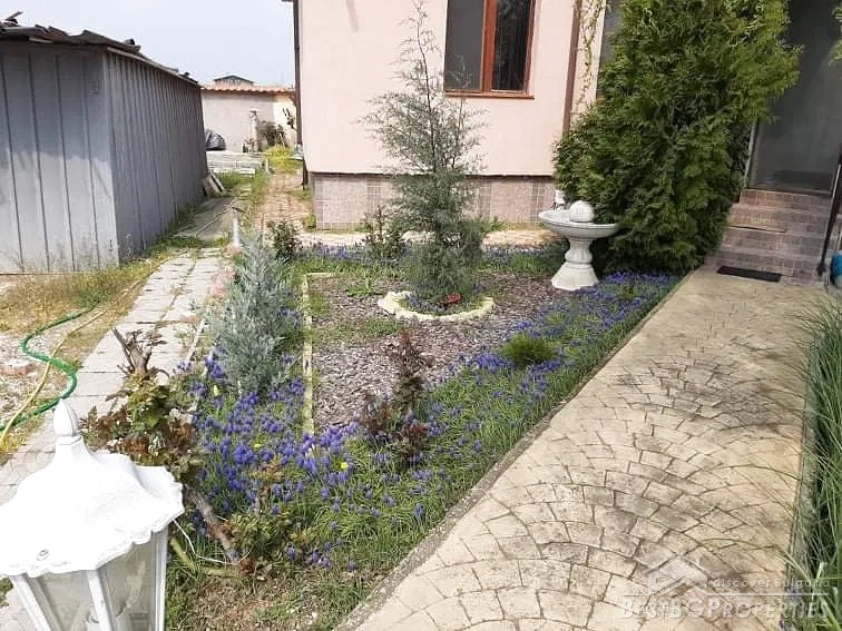 The yard is divided into two - a decorative part and a garden part. The decorative part is surrounded by a beautiful solid fence. The front door and the garage door are made of wrought iron. There is beautiful landscaping with thuja, Amazon cypress, silver pine, decorative curly willows, wisteria, pomegranates, pampas grass, various bulbous flowers, etc. This part of the yard also has a parking, a shed and a barbecue area.