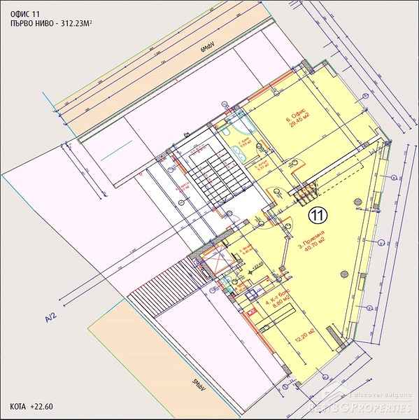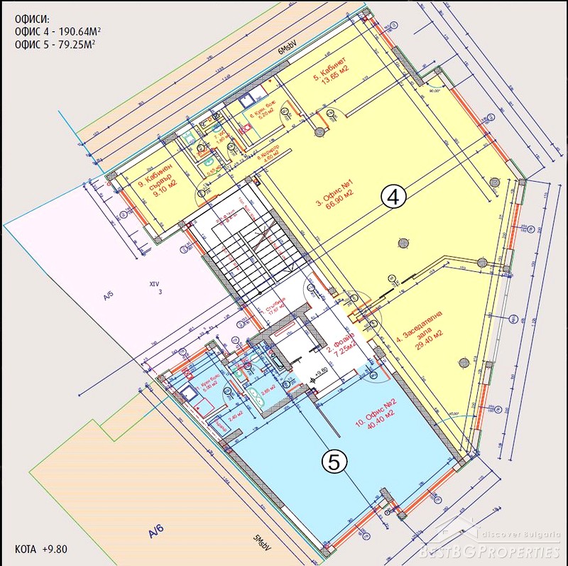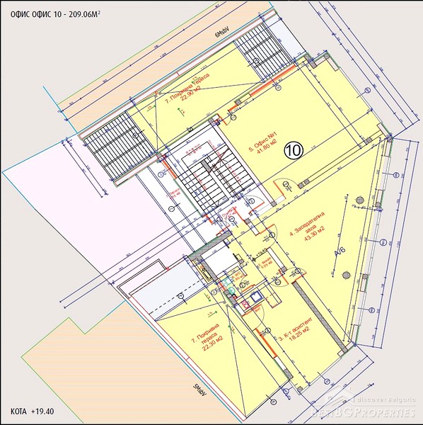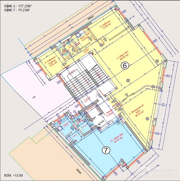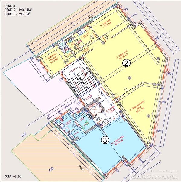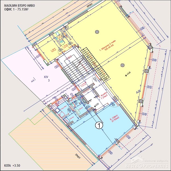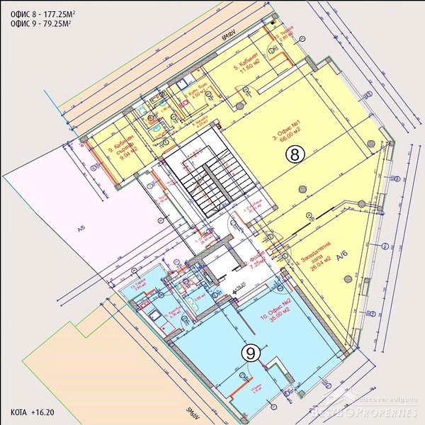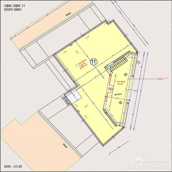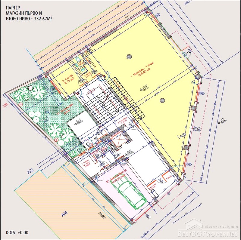The building is set on a corner of two main streets, in proximity to the center of the city in an area with all amenities and communications. There are two underground levels with total count of parking spaces - 8. The rest of the ground floor is occupied by shops which go up to the second level. On the second level there is also another office. The rest of the floors consist of offices. The balconies above the sixth level and the roof balcony on the eight are considered as green area balconies. The garden is reached from the first level of the building and is expected to be urbanized, planted and used for recreation.
