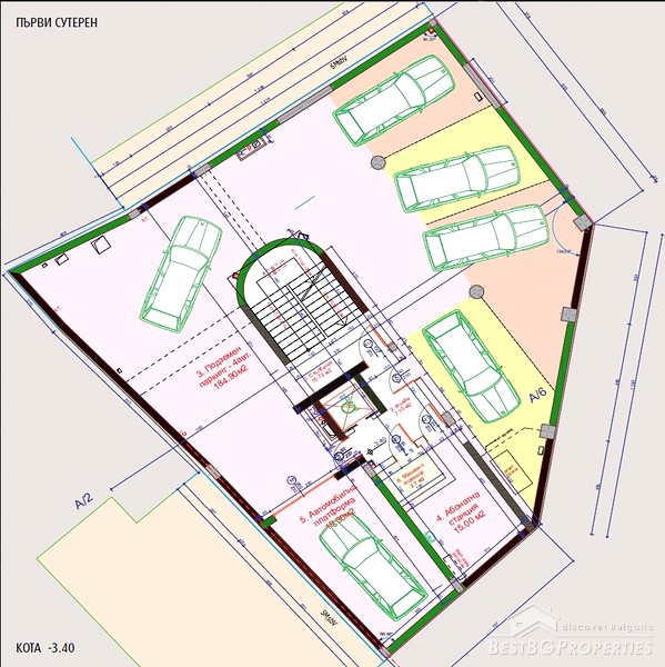 The building comprises underground garages, shops and offices. It is built on a plot with total area of 275 sq m and has built up area of 224 sq m. The total living area of the building above ground is 1981 sq m. The underground level is 540 sq m large.