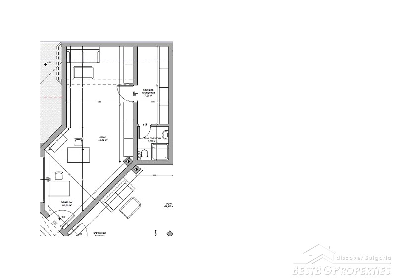 The office is fully finished - lighting, terracotta flooring and granite tiles. It is very bright and spacious, warm in winter and cool summer. The height of the ceilings is 3.2 m. The exposure is towards south-west.